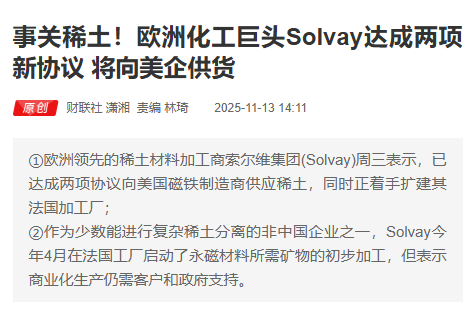 - 事关稀土!欧洲化工巨头Solvay达成两项新协议 将向美企供货2025-12-01