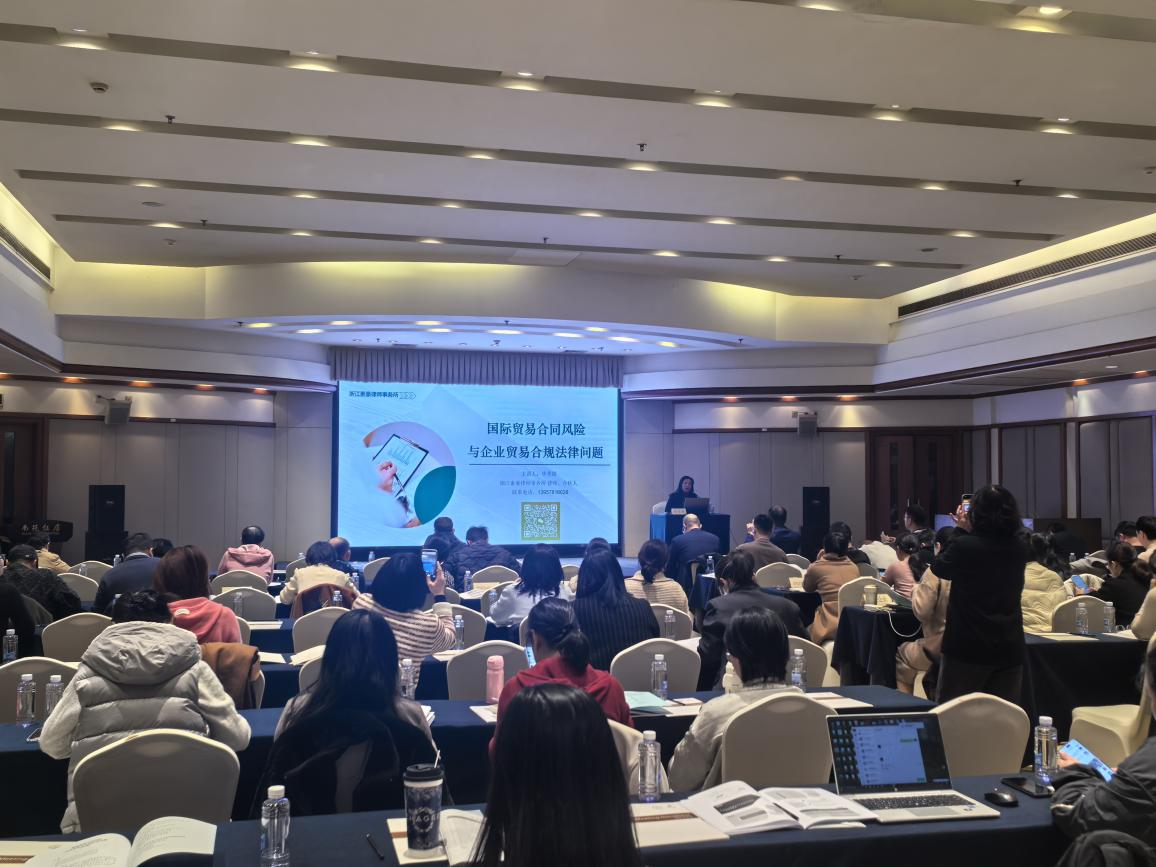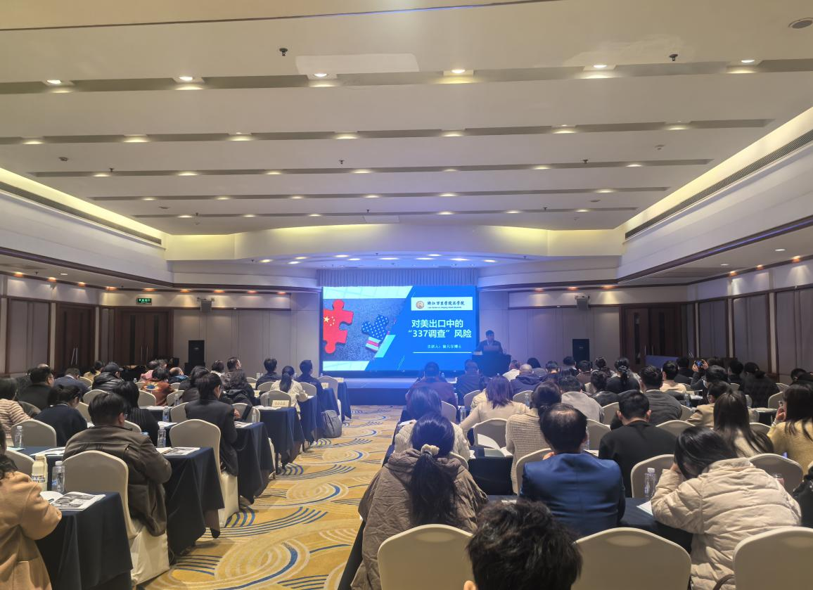 本次培训分为上下两个阶段,上午的培训中,商务部贸易救济调查局预警立案处一级调研员徐玲玲首先授课,深入讲解了进口预警机制、贸易救济调查制度及其基本程序。随后,浙江万里学院法学院讲师曾凡宇博士聚焦美国337知识产权行政调查,解析了其核心要点并为企业提供了实用的风险规避策略。下午的课程则更具实务操作性,北京大成律师事务所阮东辉律师与浙江素豪律师事务所毕秀娟律师,分别围绕“国际贸易出口管制与经济制裁应对”以及“国际贸易合同风险与企业贸易合规”两大主题进行了专业授课,从法律实务角度为企业防范外贸风险提供了宝贵建议。