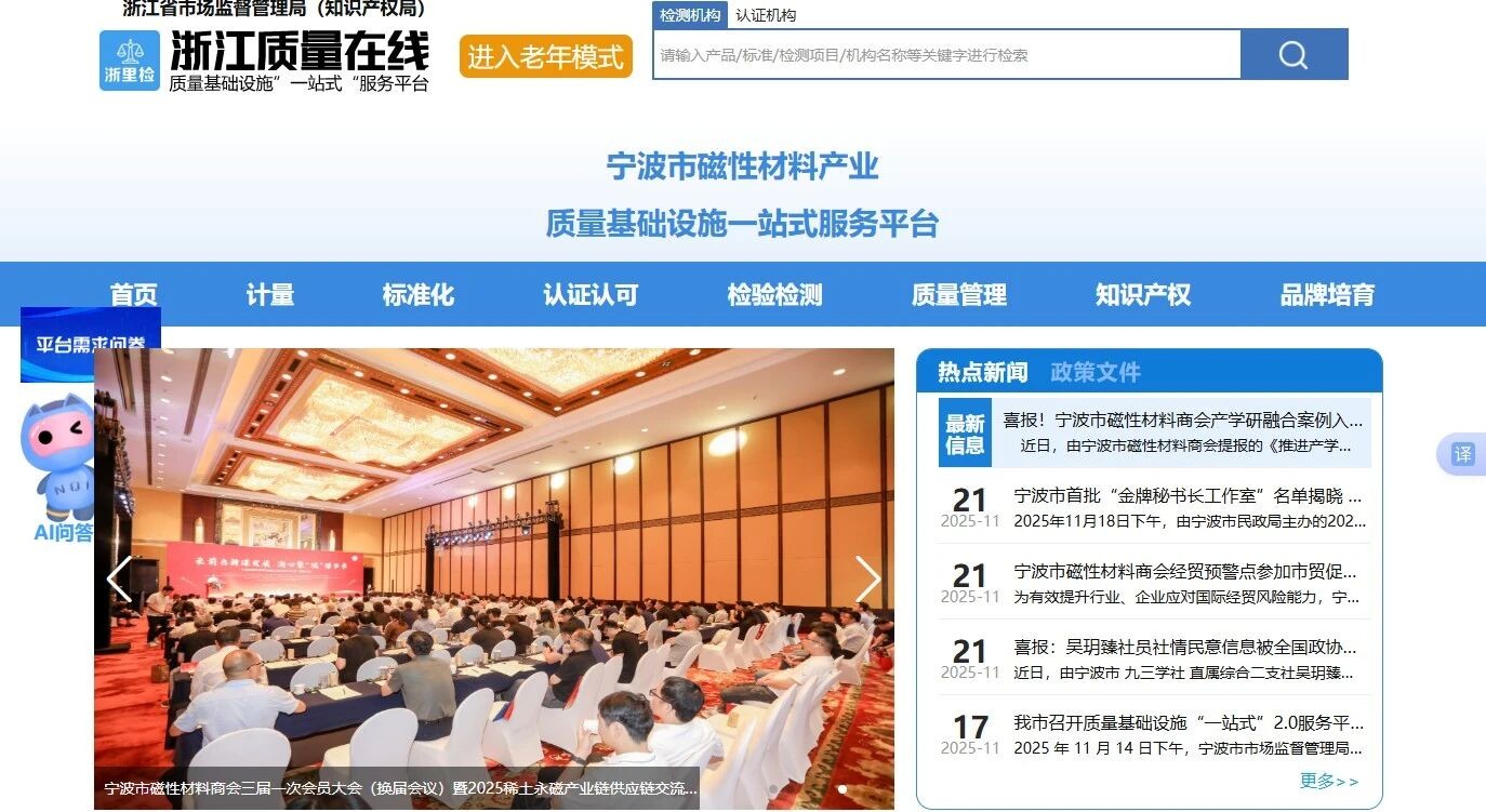 2025年7月,高端新材料(稀土永磁)产业质量基础设施一站式服务平台入选浙江省市场监督管理局关于进一步强化集成服务 打造质量基础设施一站